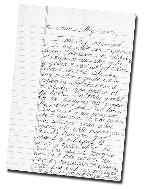 The lady that did the exam explained everything very well and was easy to chat with. She didn’t know it, but I was having a rough day as my beloved dog had just passed away. She helped me forget about that for a while and even got me to laugh. I think her name was Sarah. — Mammogram patient